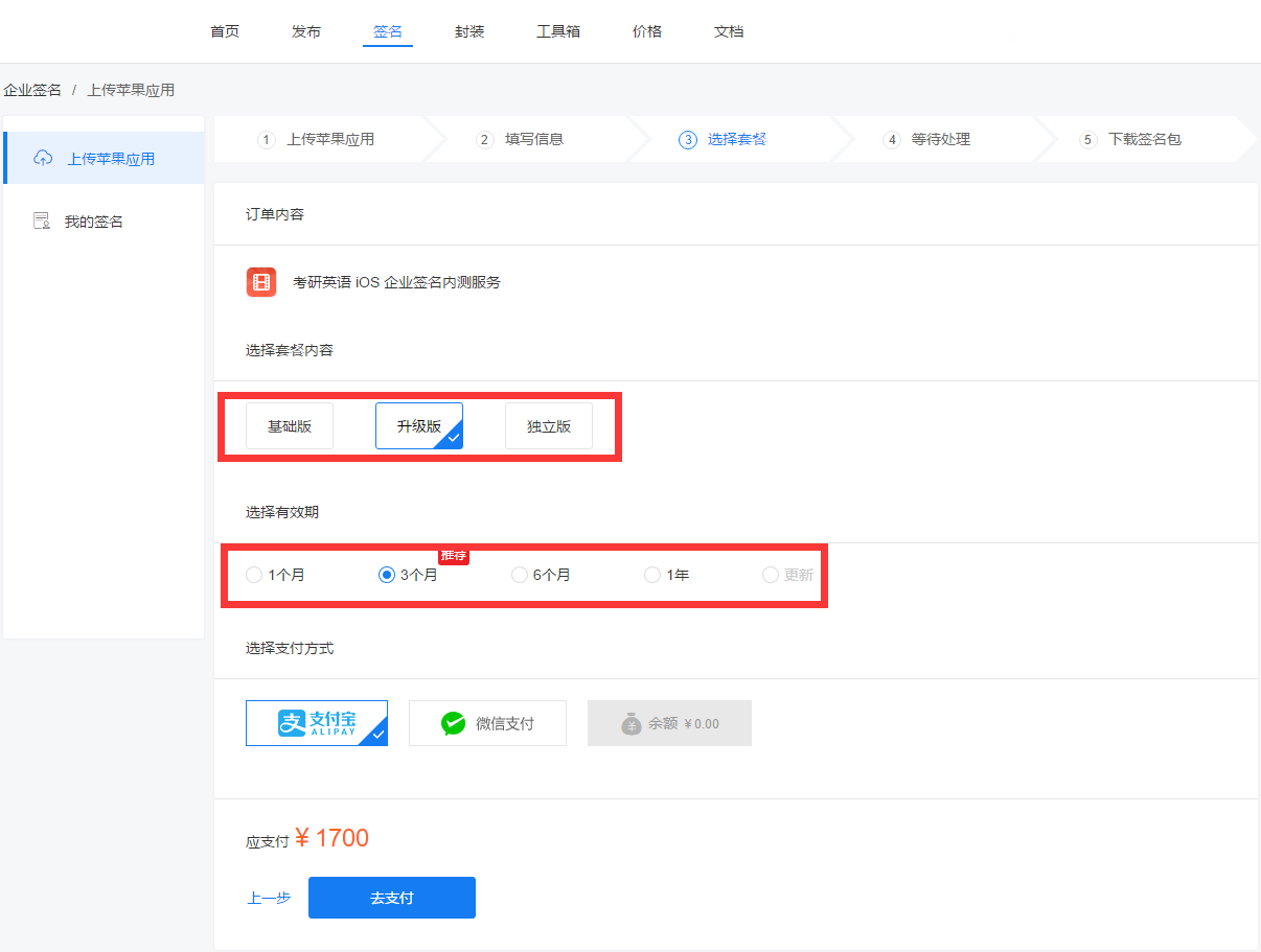 ②根据自身需求,选择签名套餐,并完成支付;